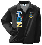 These traditional crossing line jackets are a must have for the new initiate. As with all of our crossing line jackets, the letters are sewn on applique and the organizational emblem is fully embroidered into the garment. This garment is sized for adults (men) and is constructed of 100% nylon taffeta and lined with 100% polyester brushed tricot. It features a snap front, raglan sleeves, byron collar, elastic cuffs, open bottom with NO drawcord and reinforced slash front pockets.