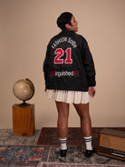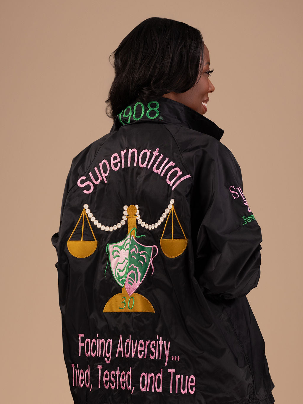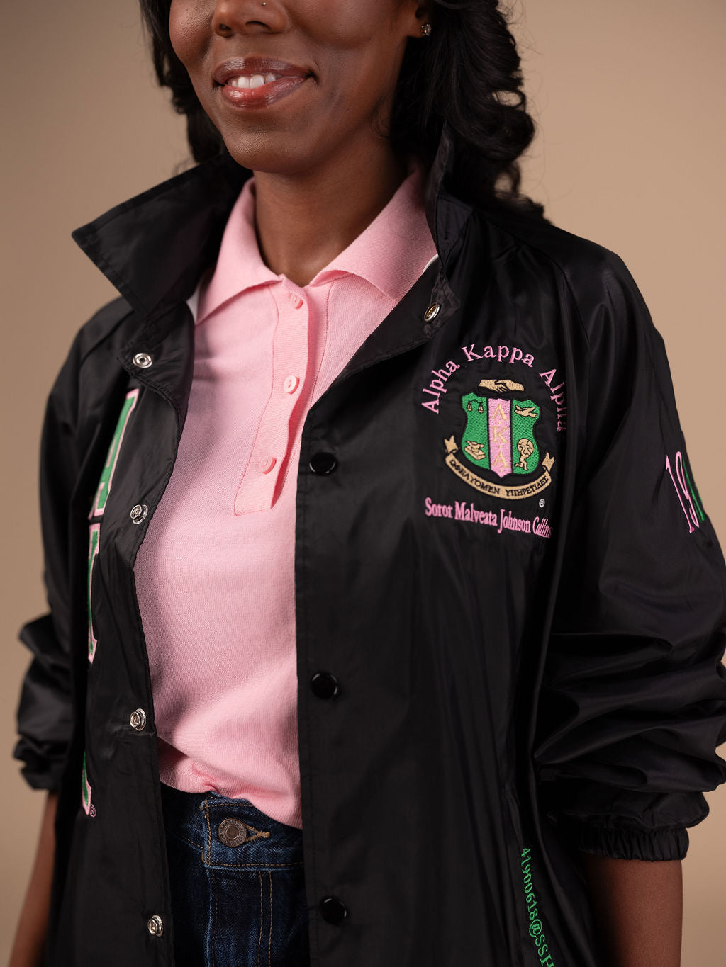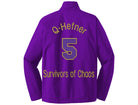 As with all of our crossing jackets, the front letters are applique and the organizational emblem is fully embroidered into the garment. This garment is sized for adults (men) and is constructed of 100% nylon taffeta and lined with 100% polyester brushed tricot. It features a snap front, raglan sleeves, byron collar, elastic cuffs, open bottom and reinforced slash front pockets. We use several brands of jackets to make these jackets. Some have draw cords at the bottom and some do not. This is out of our control. Note: Because of the large 4 inch lettering sewn on the right side, the pocket on that side may not be usable. If you want to preserve the pocket on the right side, you must specify that you want us to use 3 inch letters. For the custom lettering the back number is 6 inches and is double applique like the front letters. The other lettering is embroidered in thread.