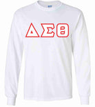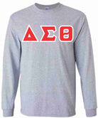 The 3 Greek letters take center stage in this classic style. The 4 inch double applique letters are sewn onto a high quality, traditional cut adult (men’s) tee. The styling is a straight cut with crew neck and rib cuffed sleeves. Colors are 100% cotton and grays contain a bit of polyester. This may be your all time fall favorite!