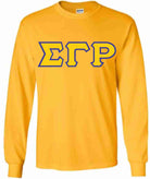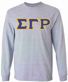 The 3 Greek letters take center stage in this classic style. The 4 inch double applique letters are sewn onto a high quality, traditional cut adult (men’s) tee. The styling is a straight cut with crew neck and rib cuffed sleeves. Colors are 100% cotton and grays contain a bit of polyester. This may be your all time fall favorite!